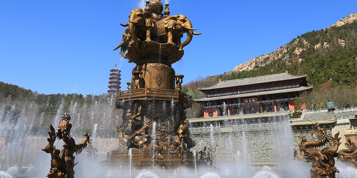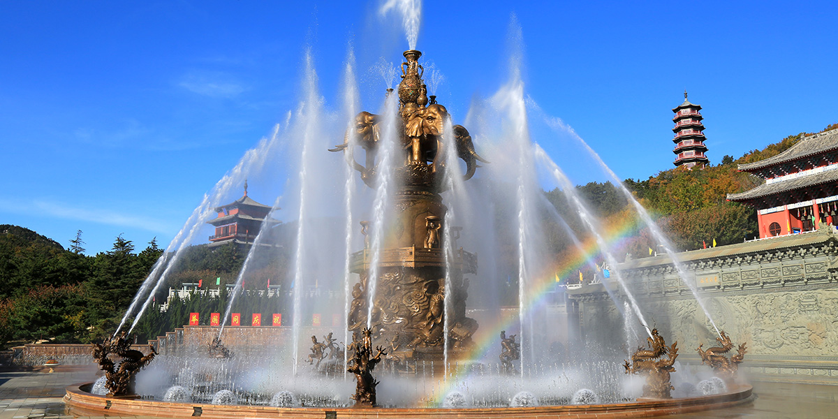 분수는 리듬에 맞춰 26가지 특이한 물 모양을 만들어 내고, 네 개의 코끼리 아래 네 개의 아치형 문이 음악에 맞춰 천천히 열린다.문에서 천천히 두 쌍의 금동옥녀가 쟁반을 들고 나와 코끼리가 뿌린 감로를 받았다.네 마리의 코끼리는 상운을 밟고 보병(宝瓶)을 등지고 동쪽에서 서쪽으로 한 바퀴 돌며 감로를 뿌리고 창생을 축복한다.4대 금강의 입에서 불꽃이 뿜어져 나오는 것은 모두의 삶과 사업이 번창한다는 것을 의미한다.곧이어 여덟 명의 선녀들이 춤을 추고, 연못가의 아홉 마리의 금룡들이 구름과 비를 따라 물기둥을 뿜어낸다.햇빛 아래서 분수에서 굴절된 칠색 네온이 나타나며 전체 동적 시연 시간은 약 15분이다.