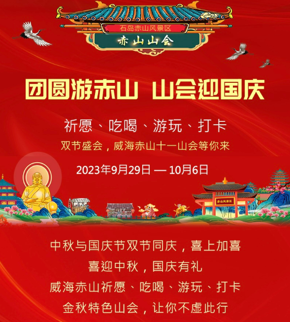 今年十一假期恰逢中秋节与国庆节双节同庆,带你们去一个有山又有海的宝藏景区——威海石岛赤山风景区。 十一黄金周赤山景区结合文化特色,以“团圆”“华诞”为核心,通过赤山特有的寺庙祈福与非遗民俗为特色,主打结合团圆祈福与民俗文化的游园会,以祈福、吃喝、游玩、打卡等方面,打造新颖有趣的山会活动。